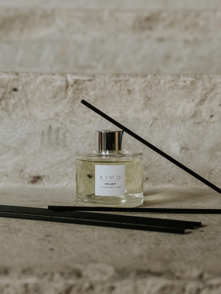 Dyfuzor VELVET otula wnętrze cytrusowo-drzewnym aromatem przez 6–8 tygodni. Patyczki uwalniają zapach powoli, dzięki czemu zawsze masz w domu atmosferę elegancji i łagodności.